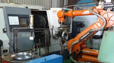 ![]() 大型円筒座標制御ハンドリングロボット1台で、CNC旋盤2台とワークステイション及び 反転装置に脱着サービスをおこなっています。 |